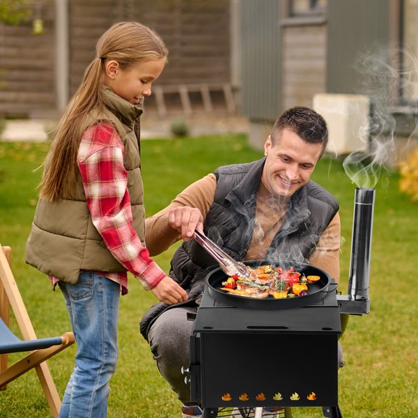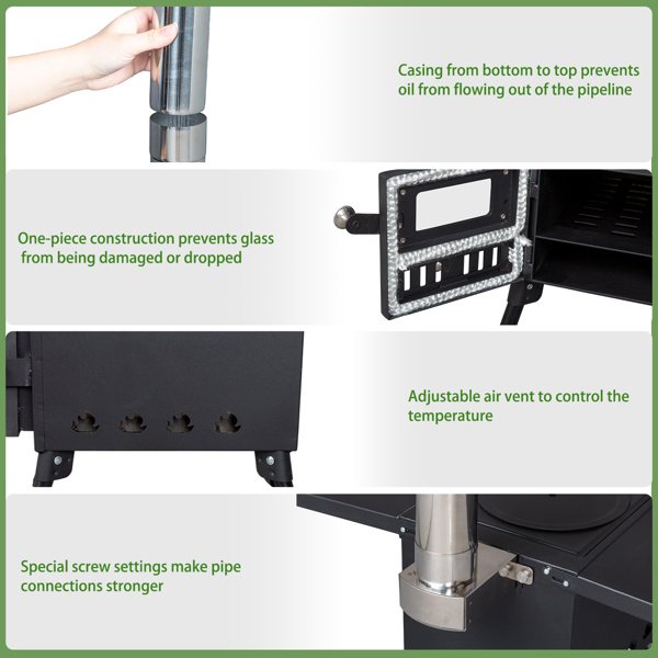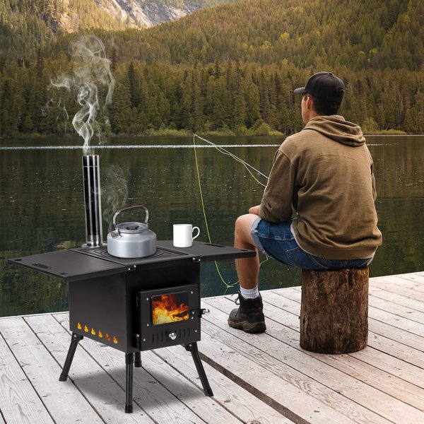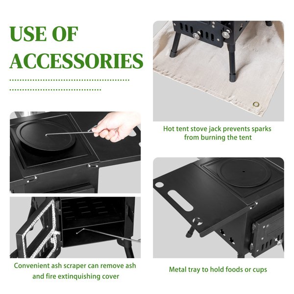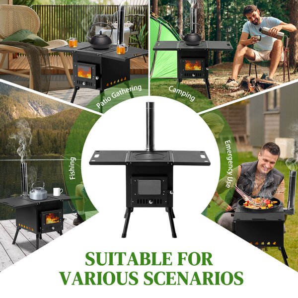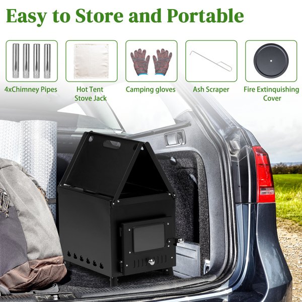 Portable Wood Stove.The folding racks on both sides increase the functionality of easy portability, 32.2lbs. The side frame can be used as a portable. The foldable legs can be folded flat under the stove. The chimney tube can be easily stored in the furnace for easy transportation and storage. The hook that comes with the wood stove makes it easy to clean the ashes at the bottom. Provide more convenience for your camping/hunting trip.