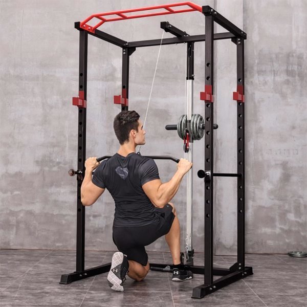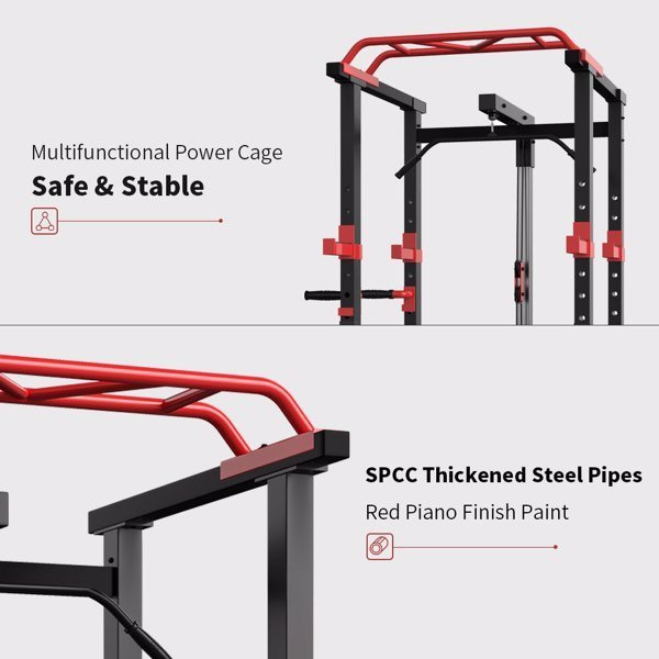 [1000lb Weight Capacity]Constructed with high-quality steel, the multi function power rack has a 1000lb weight capacity. The 2'' X 2'' frame with 12 adjustable height levels with Lat Pull-down Attachment is a functional piece of equipment that decreases the risk of injury when lifting solo and at higher weights.