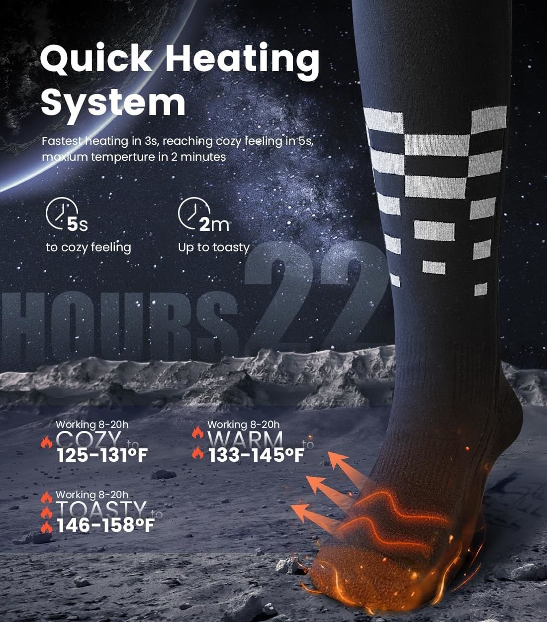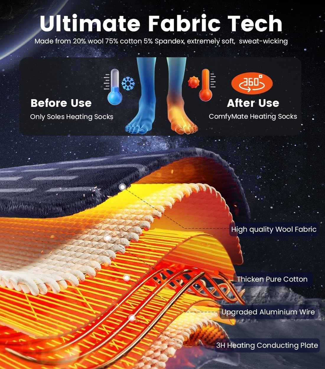 [360° All-Round Heating]- Our electric heating socks wrap heating elements around the toes, top and bottom of the foot, allowing you to experience all-round warmth. Let every inch of your feet be enveloped in soothing, even heat. No more cold spots or discomfort!