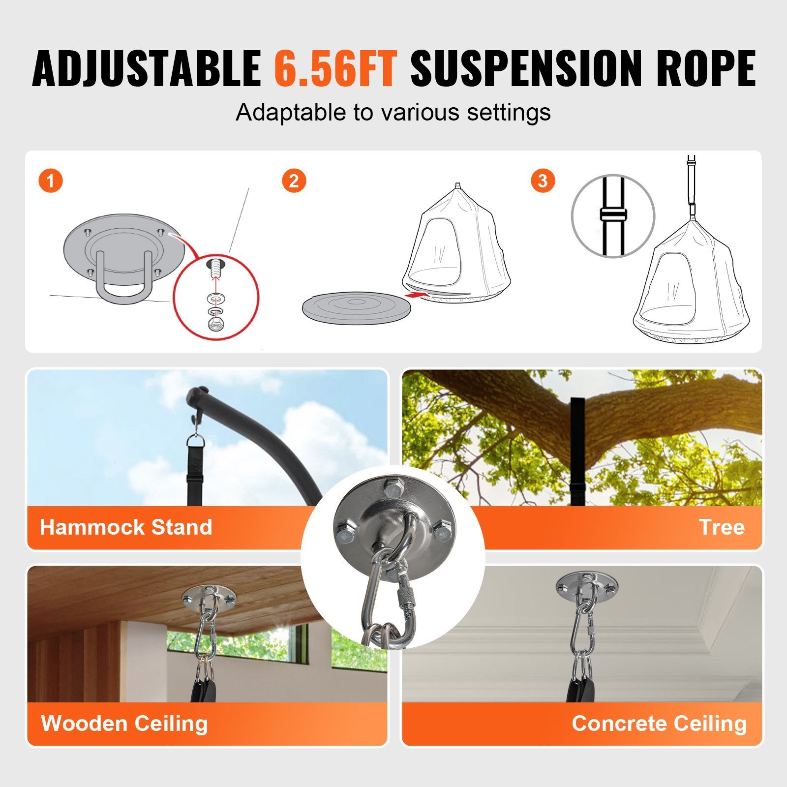 2.Adjustable 6.56ft Suspension Rope: The 6.56 ft/2 m suspension rope, with a convenient adjustable loop in the middle, is adjustable to fit various settings. Both ends feature robust steel ring attachments.